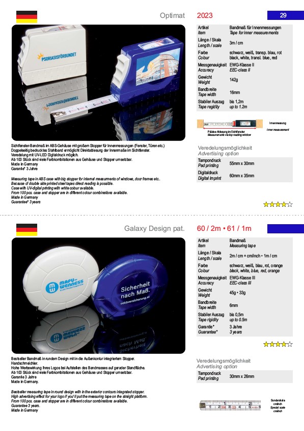 Bestseller measuring tape in round design with in the exterior contours integrated stopper.