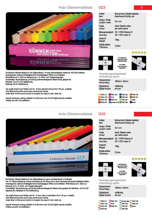 Buchenholz-Gliedermaßstab 2m der Spitzenklasse. 16 neue Standardfarben bereits ab 100 Stück lieferbar.