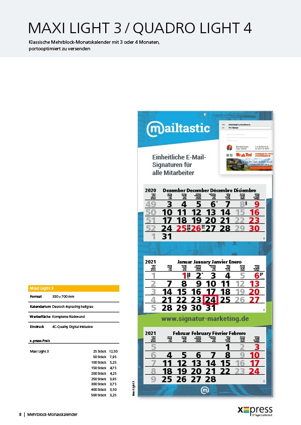 Klassische Mehrblock-Monatskalender mit 3 oder 4 Monaten,